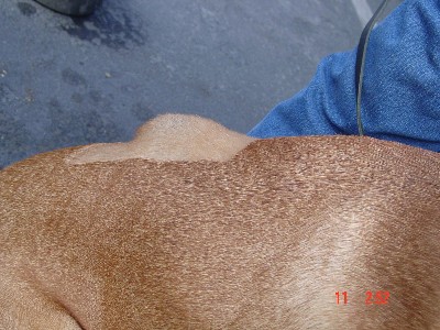 An infected Dermoid located mid back on a ridgeless mixed breed. He had a second Dermoid in the neck. His sister who is ridged, had a Dermoid in her neck.