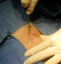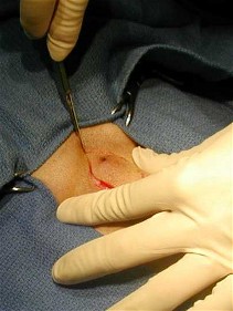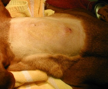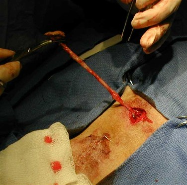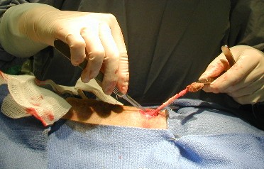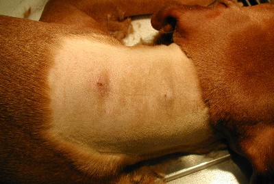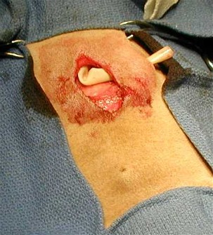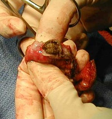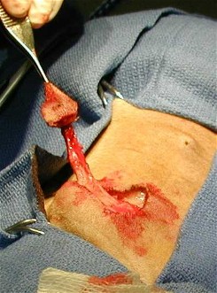 These last two photos show in exquisite detail the opening of the tube and the debris found inside that tube. This is a nine to 10 month old dog. One would not expect the build up to be so huge in such a young dog, but in fact it builds up quickly, and abscesses quite rapidly. The brown gunky tube filling is made up of dirt, debris, hair, sloughed off skin etc.