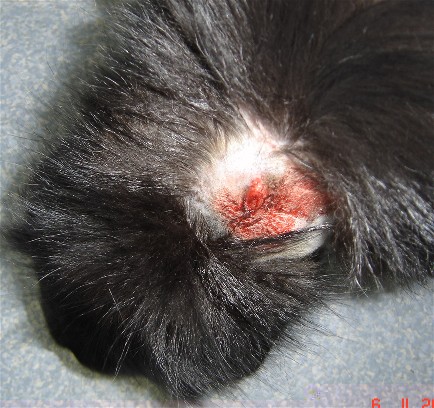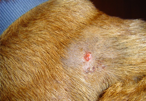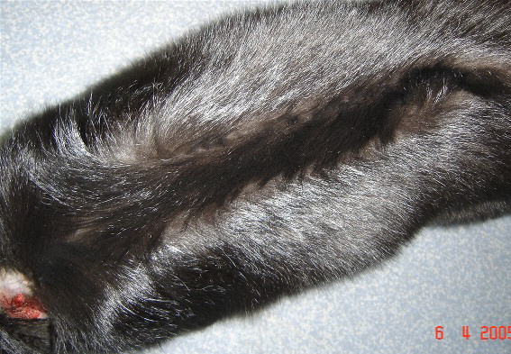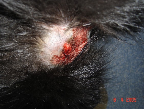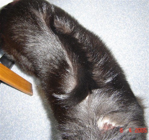 Tina is a mix of what looks like a Rhodesian Ridgeback and a Belguim Shepherd. She is nine years of age (in 2005) and has had three surgeries on this mess in her neck - her first surgery was at the age of about three years. This dog has been misdiagnosed for the past nine years. There seem to be a total of five “tubes” in her neck. The total internal scarring is severe.